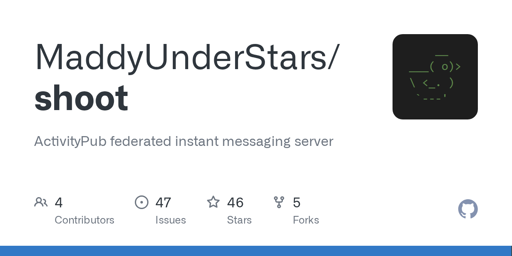 arrow-up113arrow-down1external-linkGitHub - MaddyUnderStars/shoot: ActivityPub federated instant messaging servergithub.comTeknevra@lemmy.world to Fediverse@lemmy.mlEnglish · 4 months agomessage-square9linkfedilinkfile-text