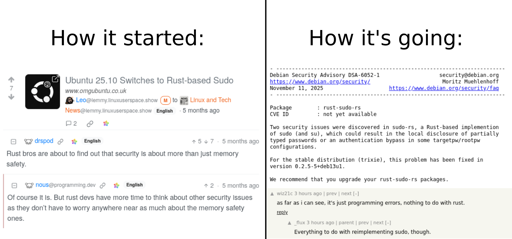 It’s always — memory safety this, error handling that… These are good reasons to pick a language for a new project, but, god damn, it’s a stupid reason for a stable program rewrite (let’s say the program is mostly in maintenance mode: no major new features are planned; correct me if that’s not the case for sudo).