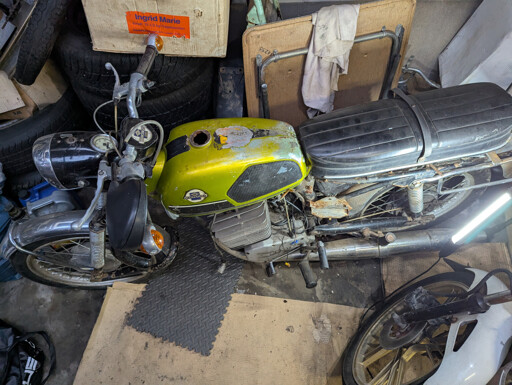 It’s pretty much complete aside from the missing battery cover and the engine turns over by hand. I had some trouble getting it into neutral, there’s definitely something wrong with the gearbox or the linkage. The tank is completely rusted inside, I’ll probably need a new one.