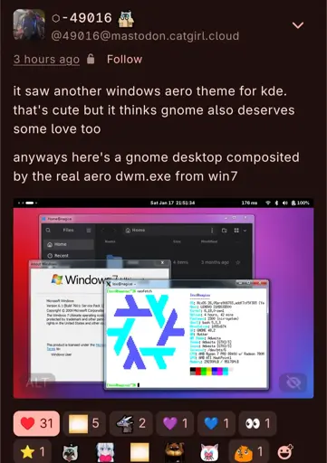 minus-squaredaggermoon@lemmy.worldlinkfedilinkarrow-up3·16 days agoI miss Aero but I don’t know if I can go back to a light theme.