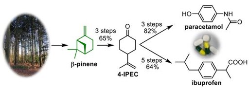 A team of scientists, from the University of Bath's Department of Chemistry and Institute for Sustainability have found a way to create two of the world's most common painkillers, paracetamol and ibuprofen, out of a compound found in pine trees, one which is also a waste product from the paper industry.