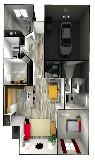 Thermostat is in the center, if clicked it opens the thermostat options. The background glow of the temperature turns blue when cooling and red when heating (black when idle)