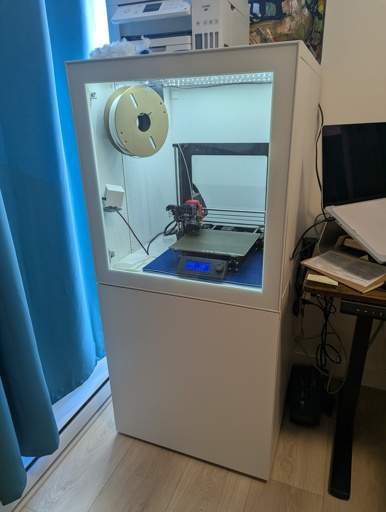 A friend gave me this Prusa MK3S+ a few years ago and it came inside a set of Besta storage cabinets, 2x 40cm deep ones. Its was always a bit unwieldy in my small apartment and since it was on the ground, I have to always bend down to do anything.