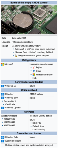 It’s a meme about how draining the cmos battery bricked some PC’s, I think. It’s formatted like the Wikipedia sidebar summary for articles on wartime battles.